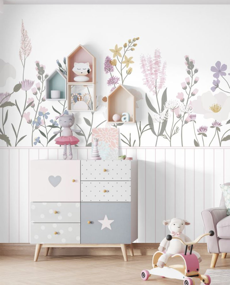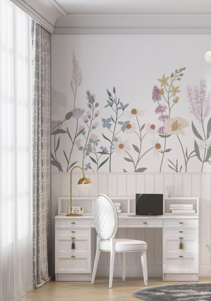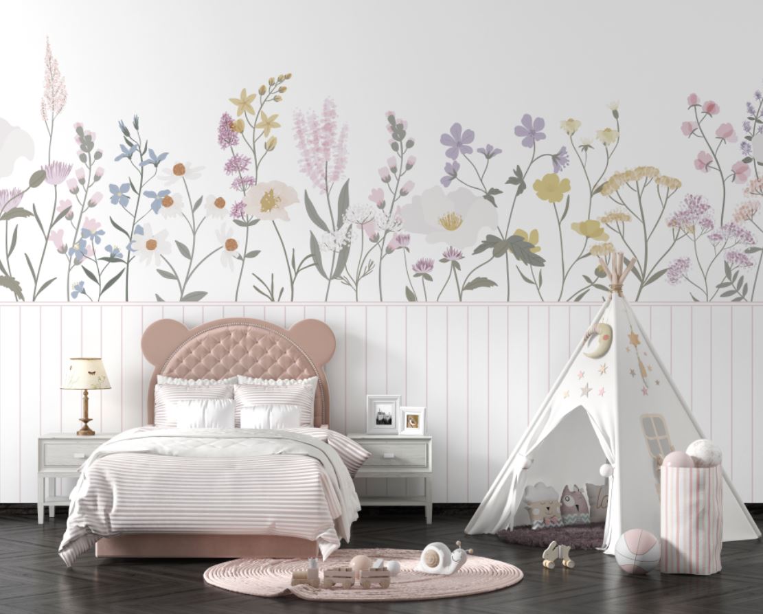 • Alt Kısımları Ahşap Desenli Üst Kısımları Renkli Çiçekli Duvar Kağıdı 3 boyutlu şekilde satın alın!