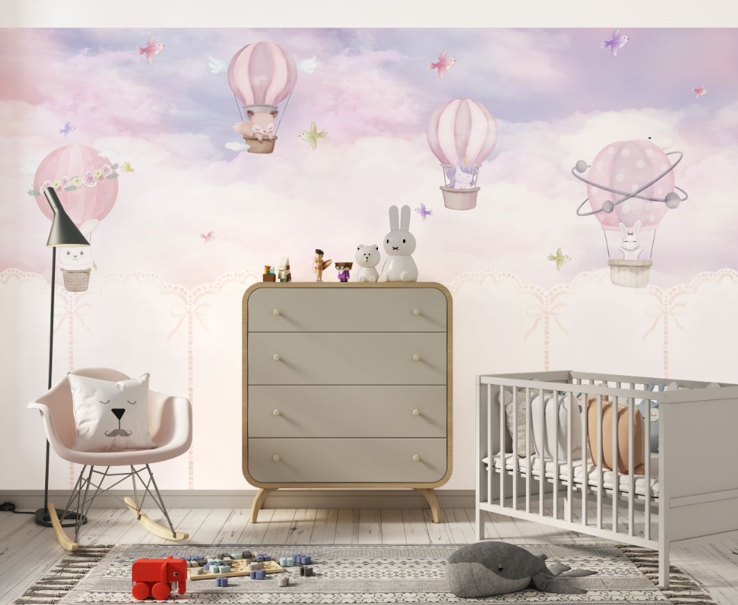 Alt Kısmı Kurdale Desenli Üst Taraf Uçan Balonlar Çocuk odası duvar kağıdı