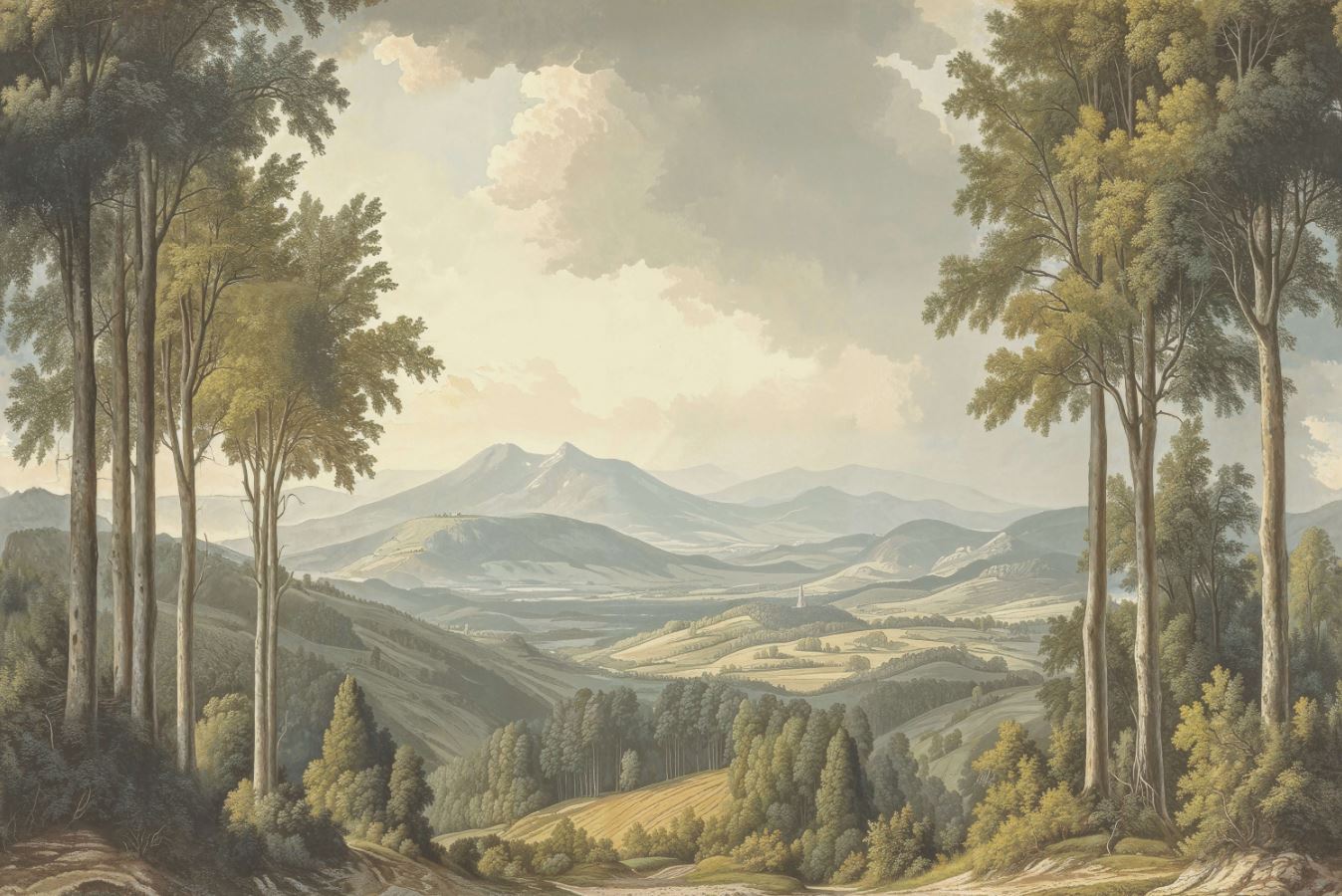 • Antik Duvar Kağıdı Ağaçlar arasında Dağ Manzarası 3 boyutlu şekilde satın alın!
