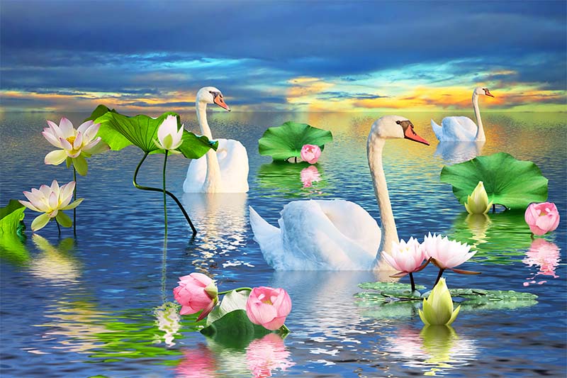 • Beyaz Kuğular ve Renkli Yapraklar Duvar Kağıdı 3 boyutlu şekilde satın alın!