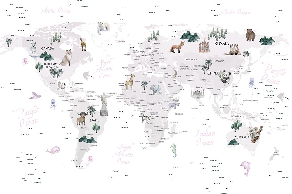 • Beyaz Zemin Dünya Haritası Çocuk Odası Duvar Kağıdı 3 boyutlu şekilde satın alın!