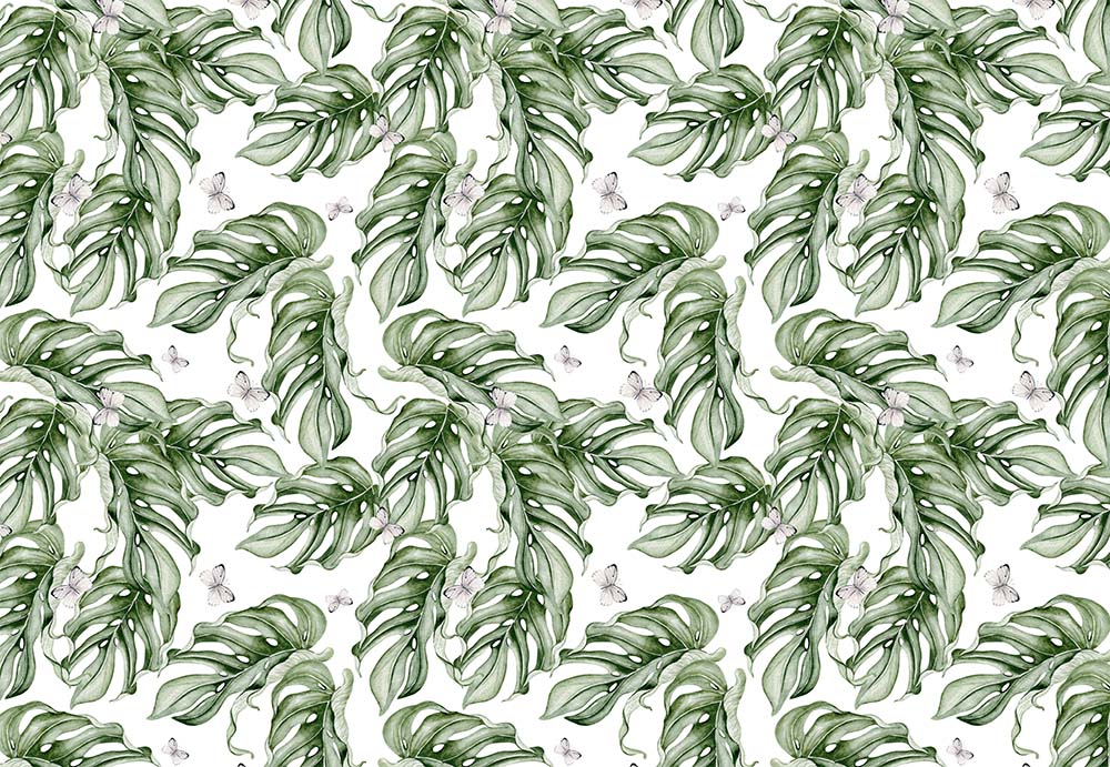 • Beyaz Zemin Tropik Yapraklar ve Kelebekler Duvar Kağıdı 3 boyutlu şekilde satın alın!