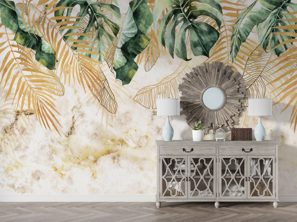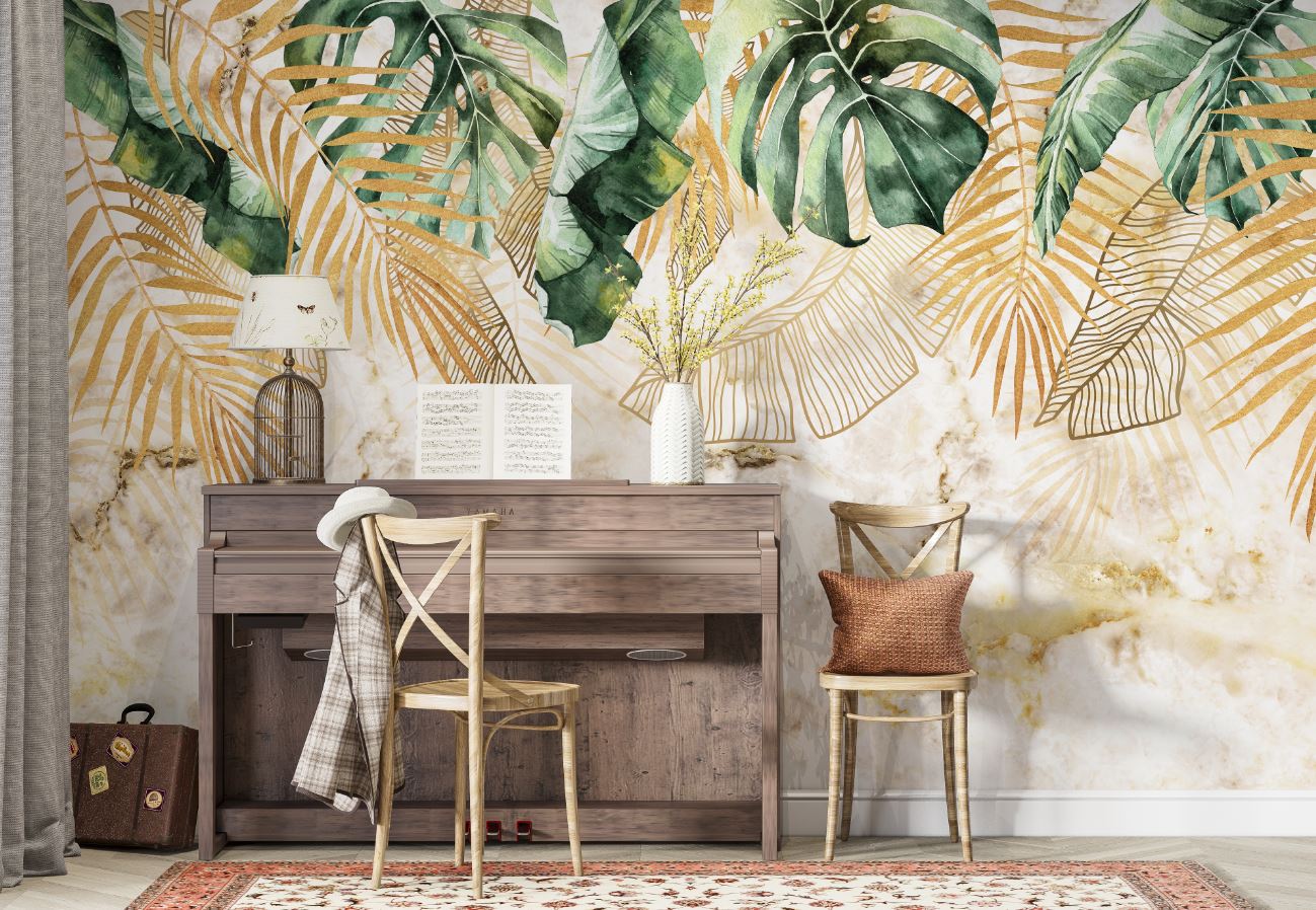 • Büyük Yeşil Tropik Yapraklar ve Gold Yapraklar Duvar Kağıdı 3 boyutlu şekilde satın alın!