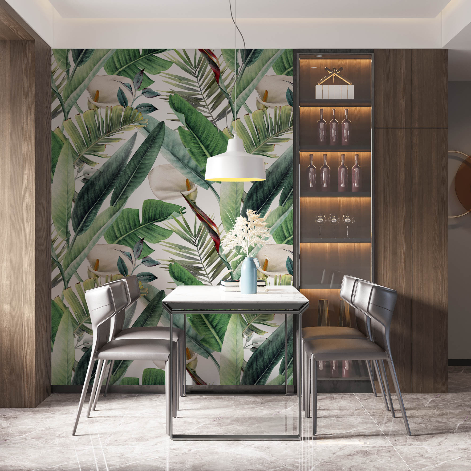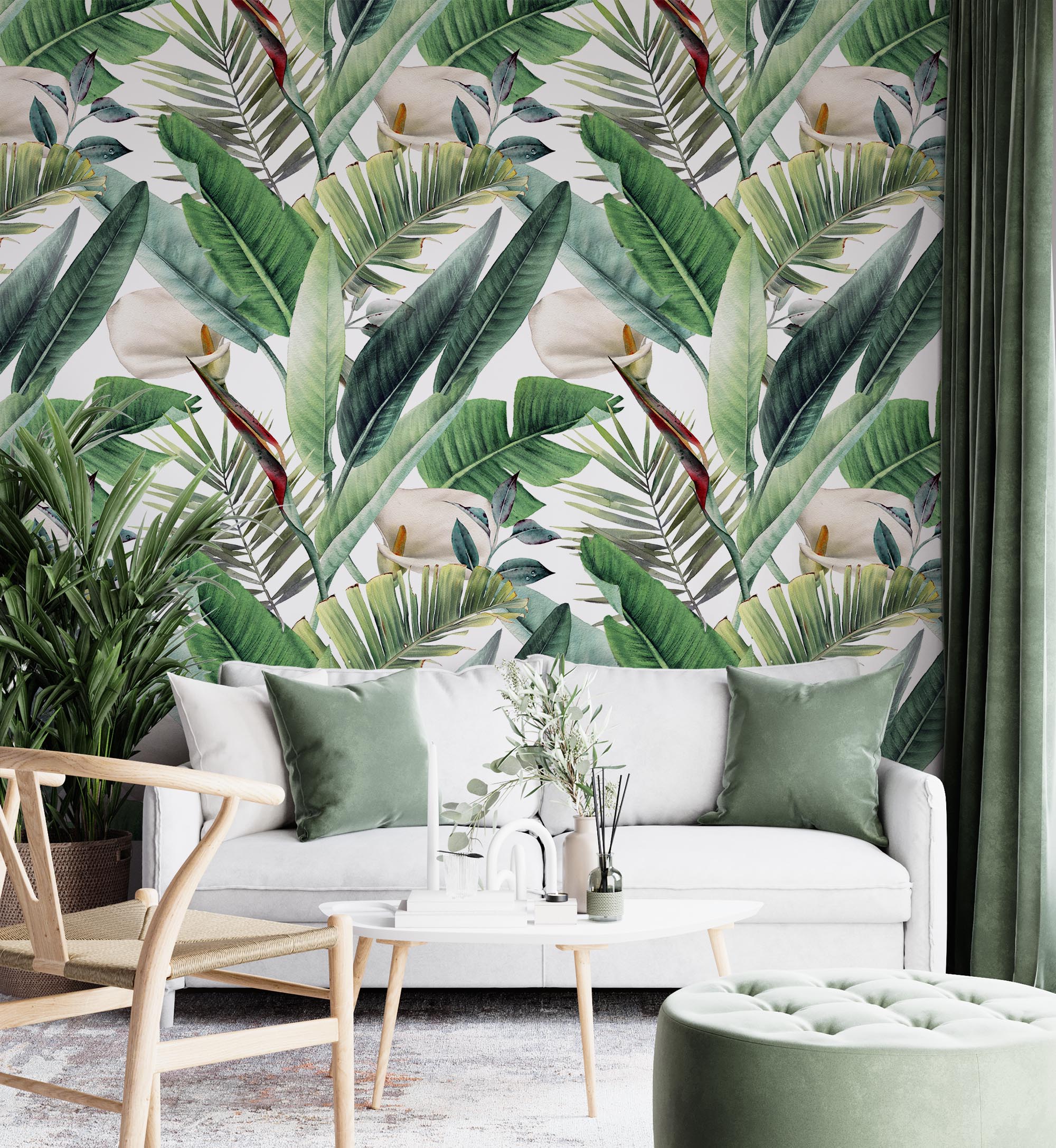 • Büyük Yeşil Yapraklar ve Çiçekler Duvar Kağıdı 3 boyutlu şekilde satın alın!