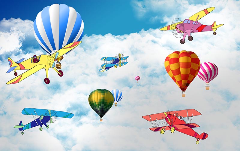 • Gökyüzünde Uçaklar ve Balonlar Duvar Kağıdı 3 boyutlu şekilde satın alın!