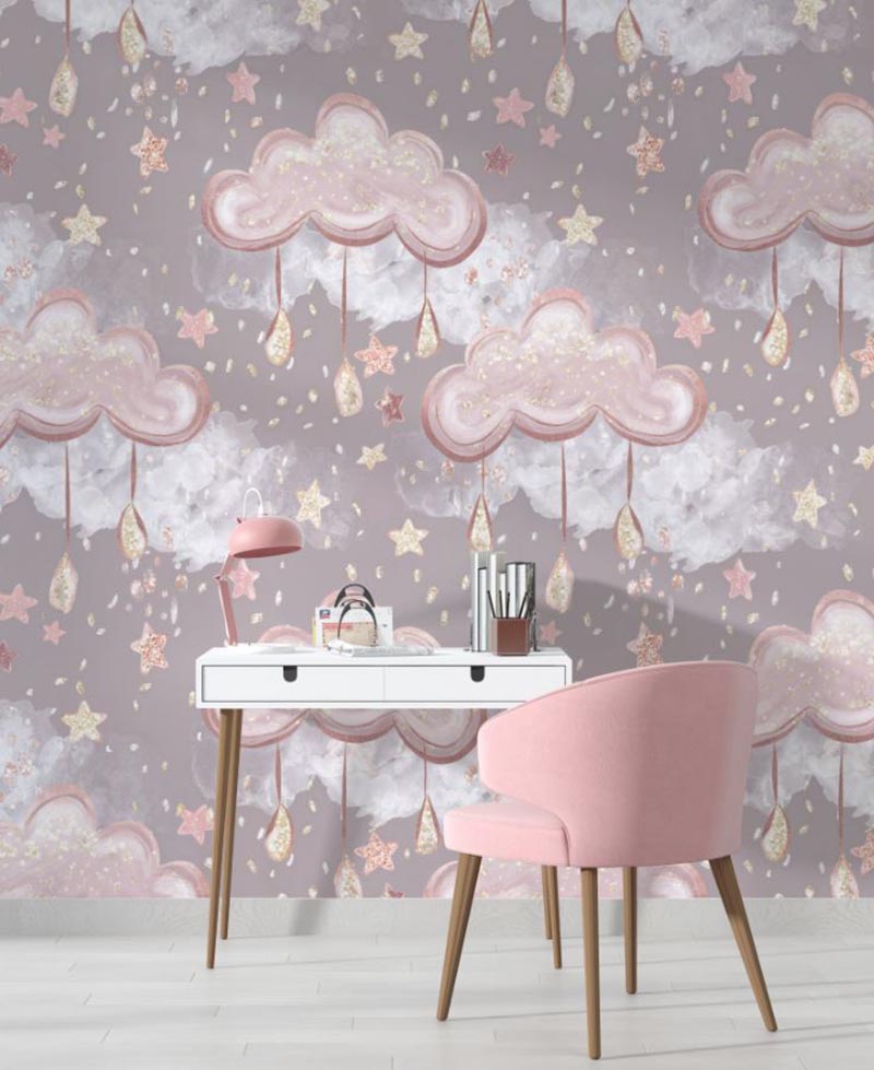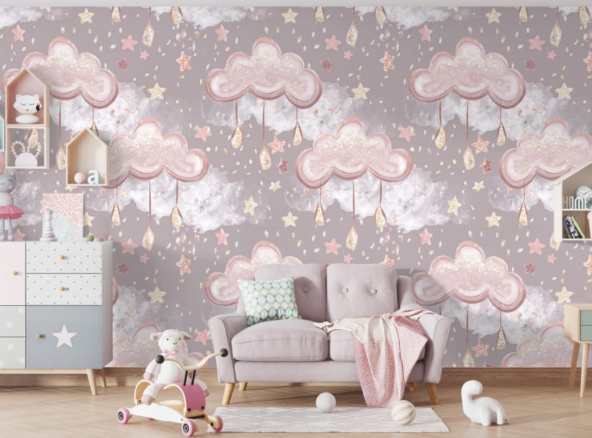 • Kız Çocuk Odası Duvar Kağıdı Pembe Bulutlar ve Damlalar 3 boyutlu şekilde satın alın!