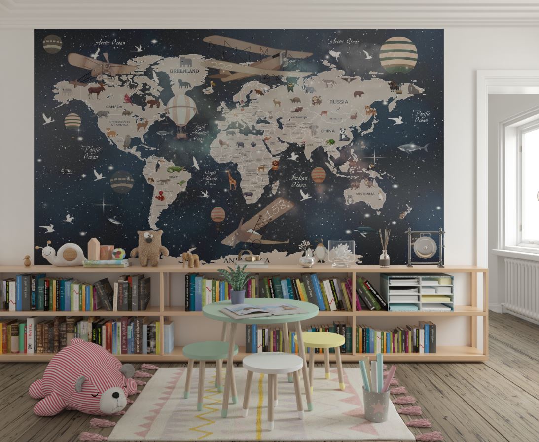 • Koyu Renklerde Eğitici Çocuk Odası Dünya Haritası Duvar Kağıdı 3 boyutlu şekilde satın alın!