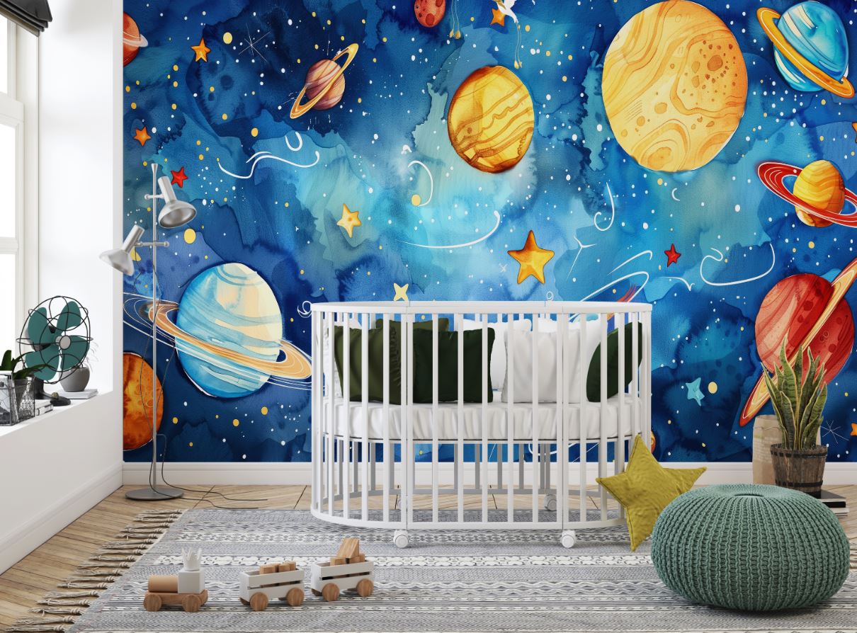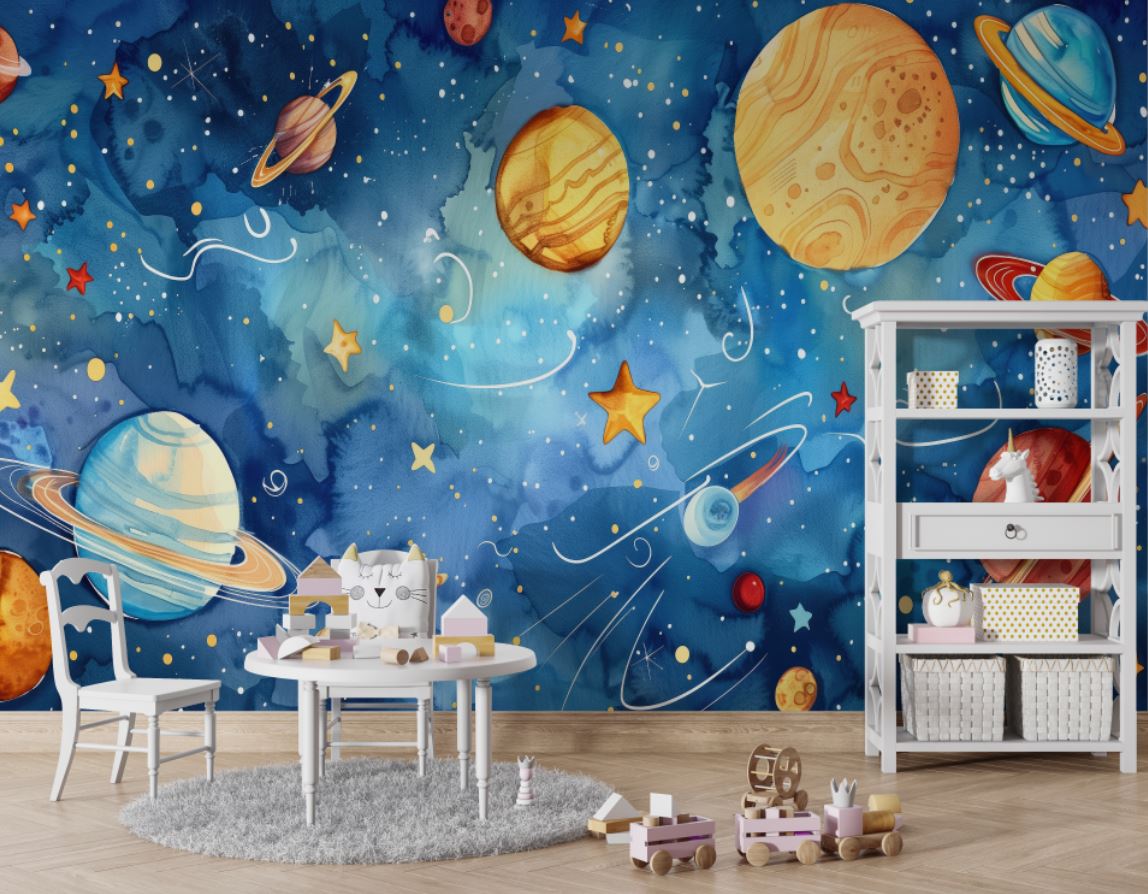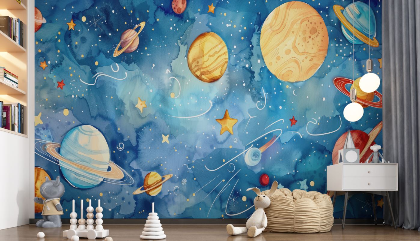 • Mavi Galaksi ve Renkli Gezegenler Çocuk Odası Duvar Kağıdı 3 boyutlu şekilde satın alın!