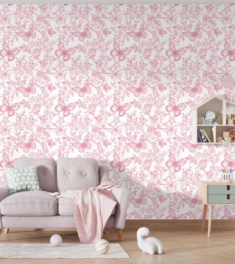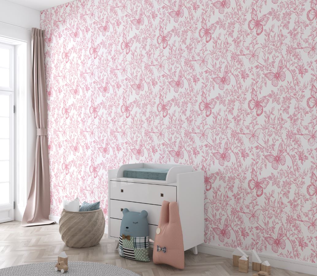 Pembe Kelebekler ve Çiçekler Kız Çocuk Odası Duvar Kağıdı