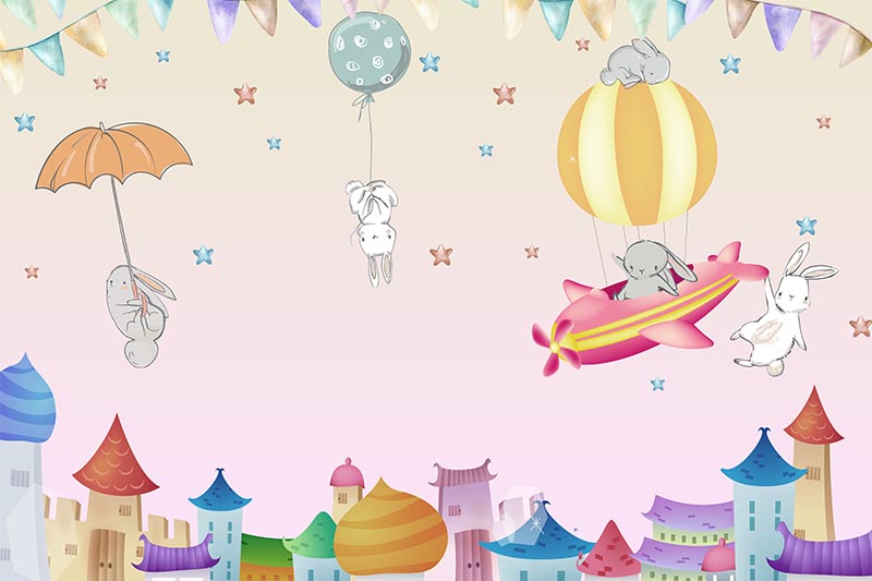 • Renkli Binalar Üzerinde Tavşanlar Duvar Kağıdı 3 boyutlu şekilde satın alın!
