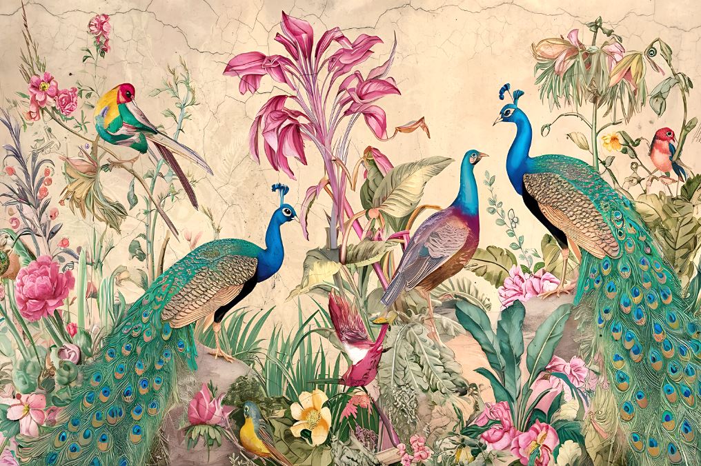 • Renkli Çiçekler Arasında Tavus Kuşları Duvar Kağıdı 3 boyutlu şekilde satın alın!