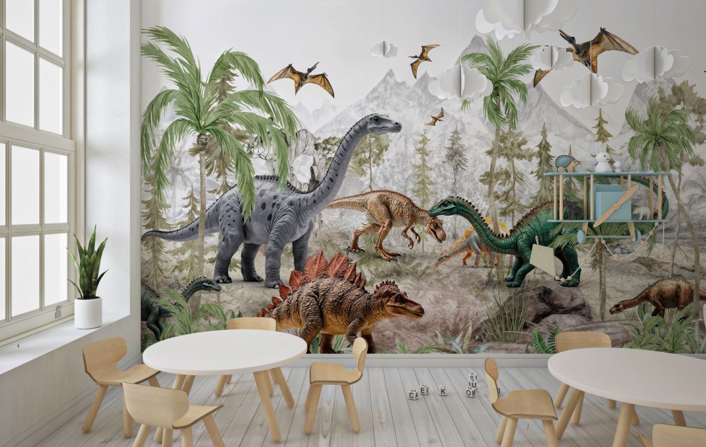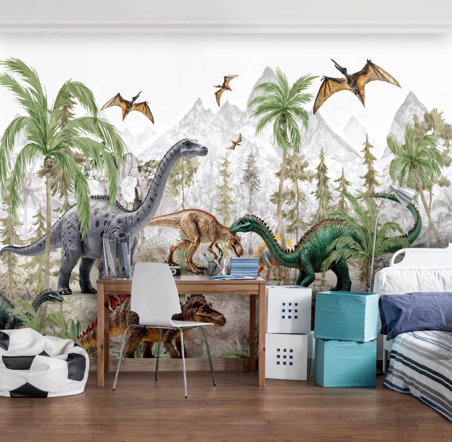 • Renkli Dinozorlar Çocuk ve Kreş Duvar Kağıdı Tasarımı 3 boyutlu şekilde satın alın!