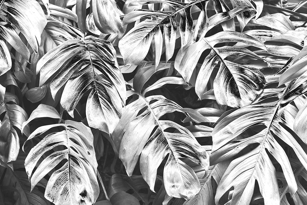 • Siyah - Beyaz Büyük Tropikal Yapraklar Duvar Kağıdı 3 boyutlu şekilde satın alın!