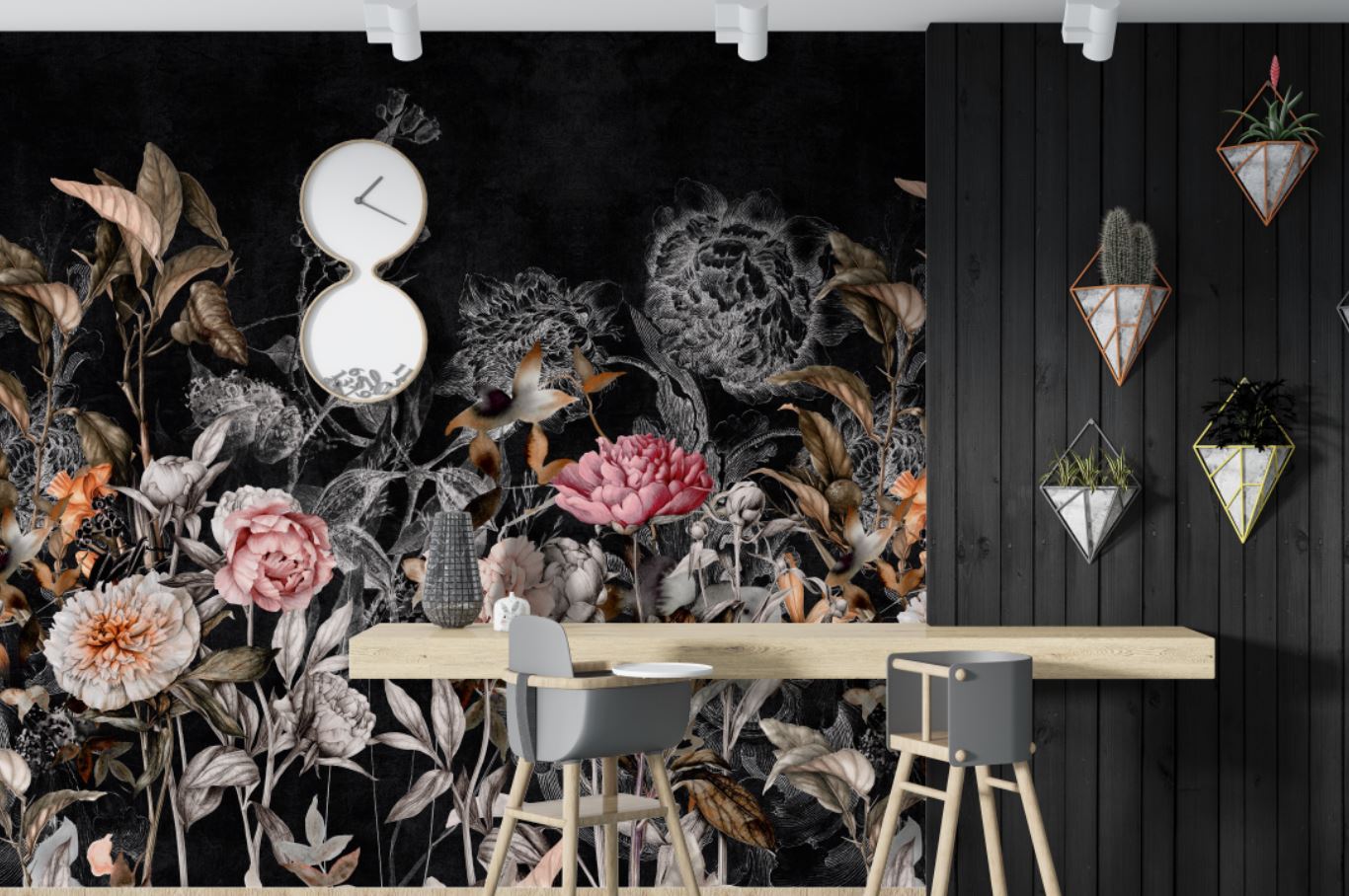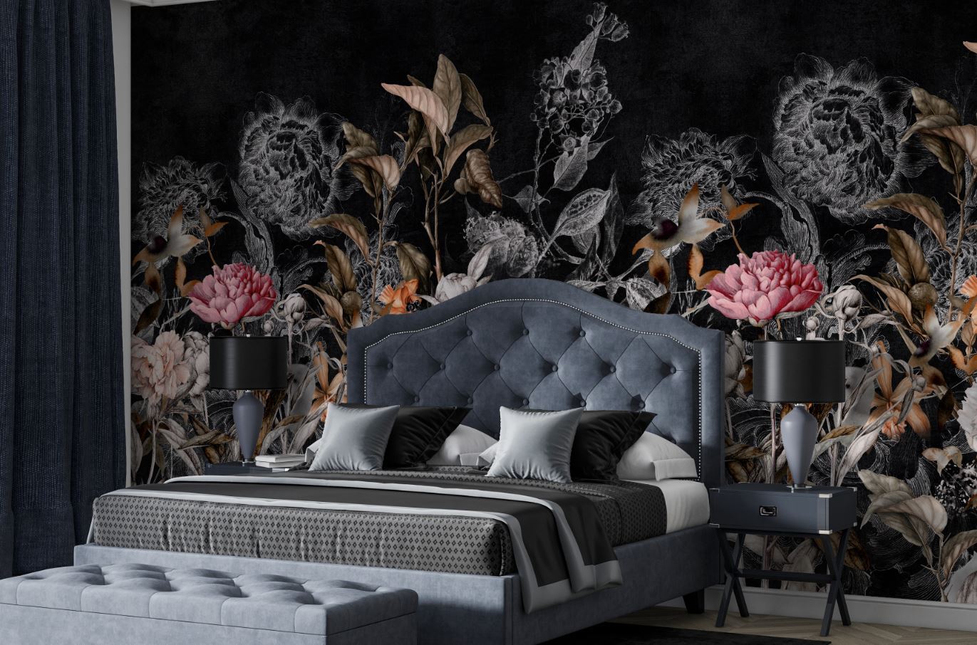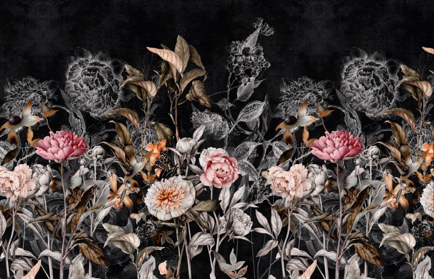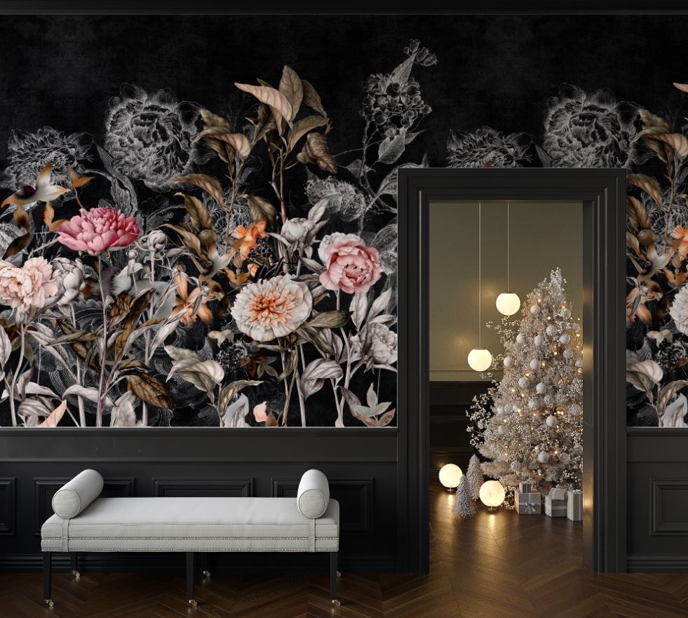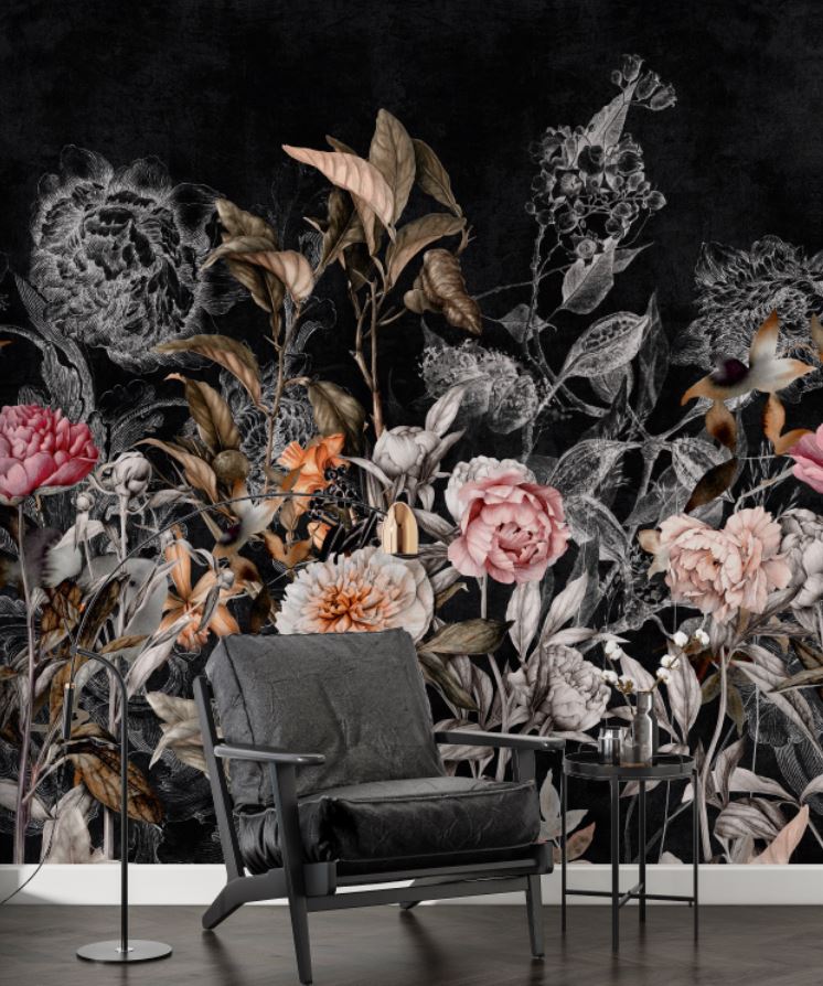 Siyah Zemin Eskitme Tarz Renkli Çiçekler ve Dallar