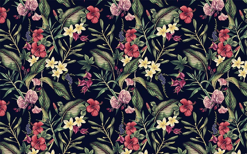Siyah Zemin Çiçekler ve Tropikal Yapraklar