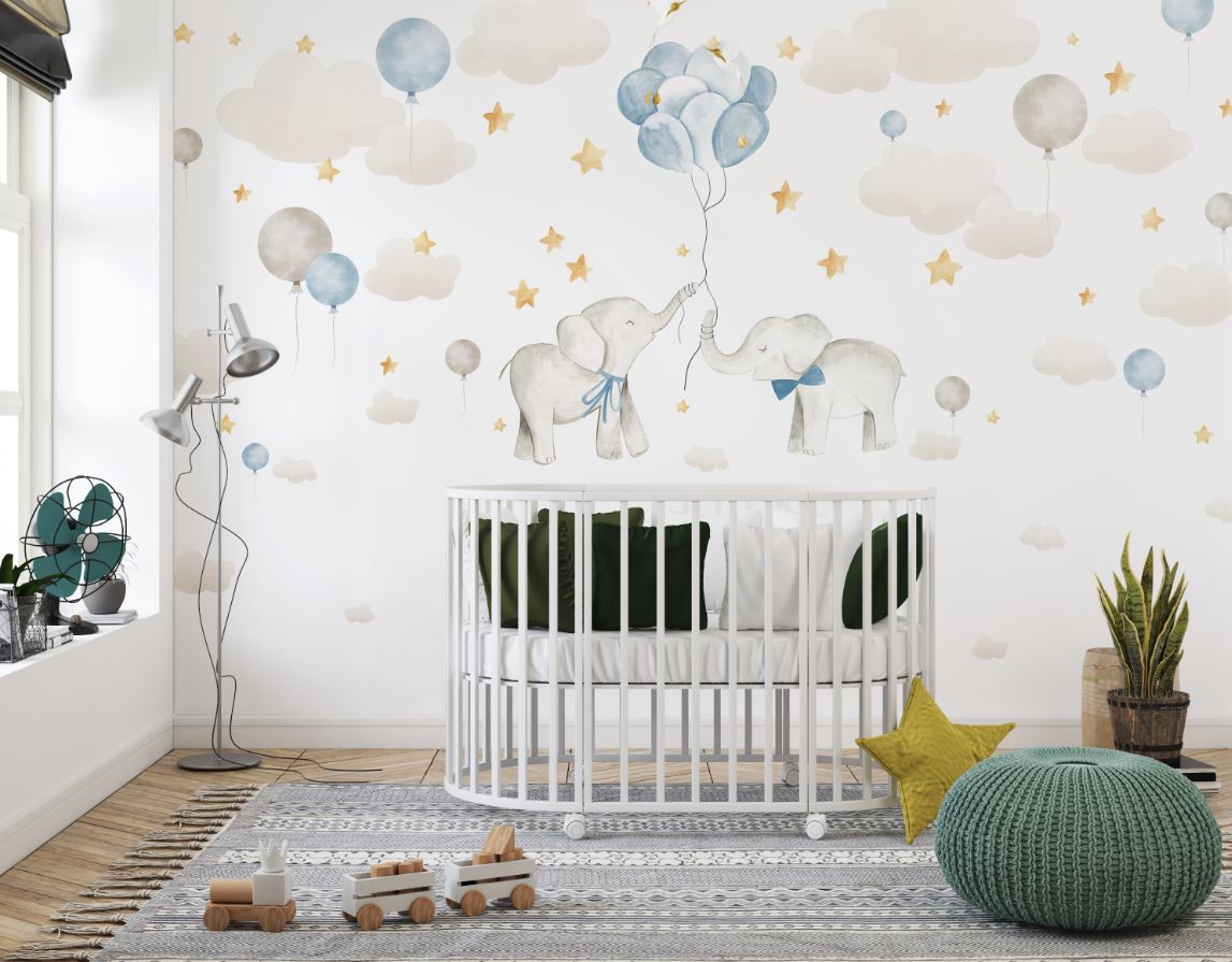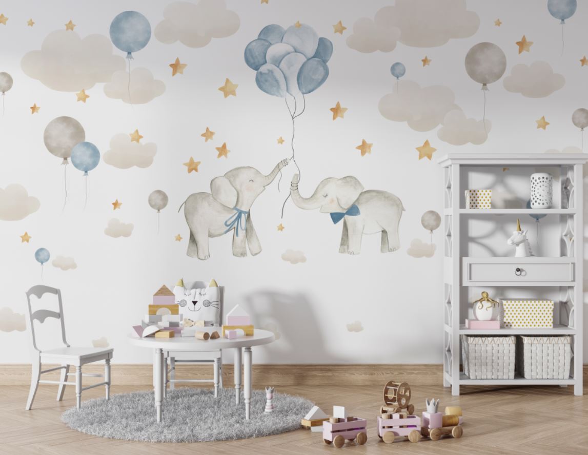 • Suluboya Tarz Bulutlar Balonlar ve Sevimli Filler Çocuk Odası Duvar Kağıdı 3 boyutlu şekilde satın alın!