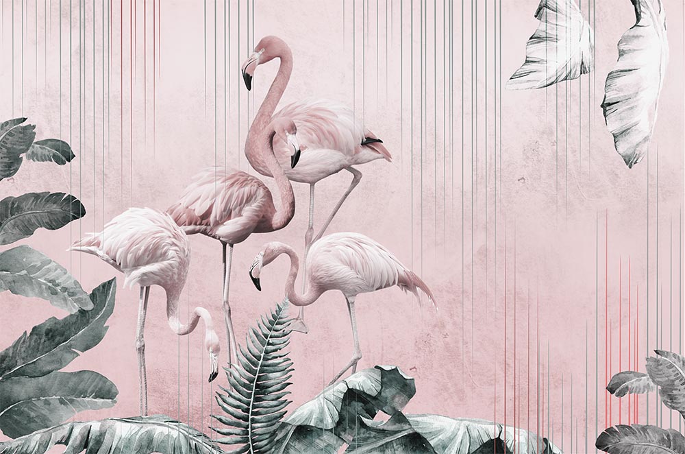 • Tropikal Yapraklar Arasında Flamingolar Tasarım Duvar Kağıdı 3 boyutlu şekilde satın alın!