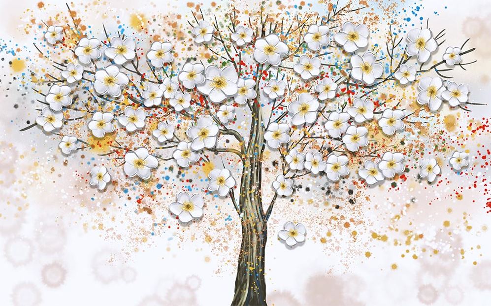 • 3 Boyutlu Ağaç Üzerinde Çiçekler Duvar Kağıdı 3 boyutlu şekilde satın alın!