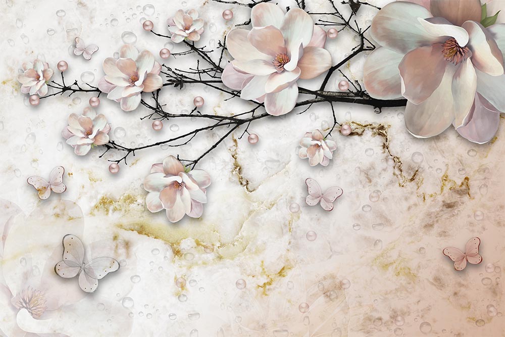 • 3 Boyutlu Duvar Kağıdı Ağaç Dalları ve Pembe Çiçekler 3 boyutlu şekilde satın alın!