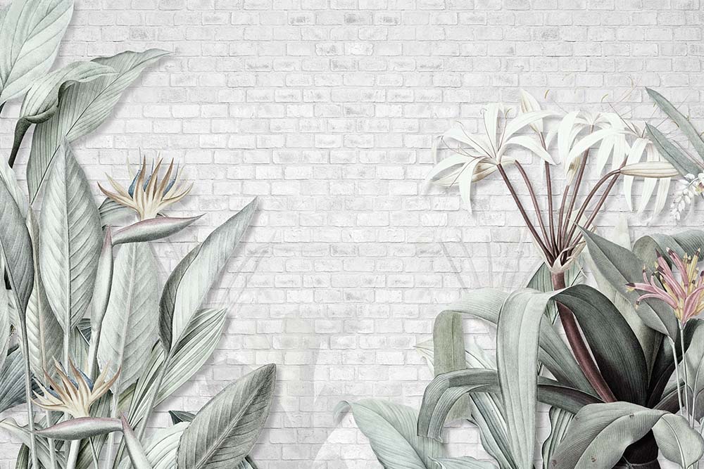 • 3D Taş Duvar Üzerinde Tropikal Ağaç ve Yapraklar Duvar Kağıdı 3 boyutlu şekilde satın alın!
