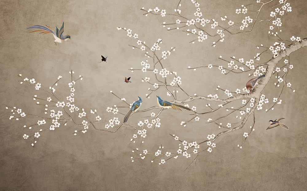 • Ağaç Dalları Çiçekler ve Kuşlar Duvar Kağıdı 3 boyutlu şekilde satın alın!