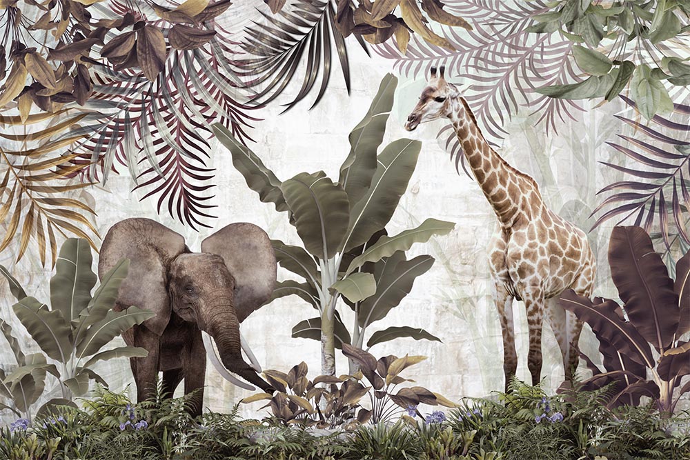• Ağaçlar Arasında Fil ve Zürafa Duvar Kağıdı 3 boyutlu şekilde satın alın!