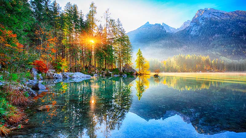 Ağaçlar Arasında Güneş ışıkları ve Göl Manzarası