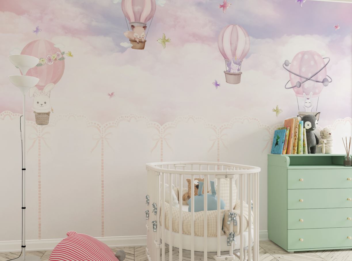 Alt Kısmı Kurdale Desenli Üst Taraf Uçan Balonlar Çocuk odası duvar kağıdı
