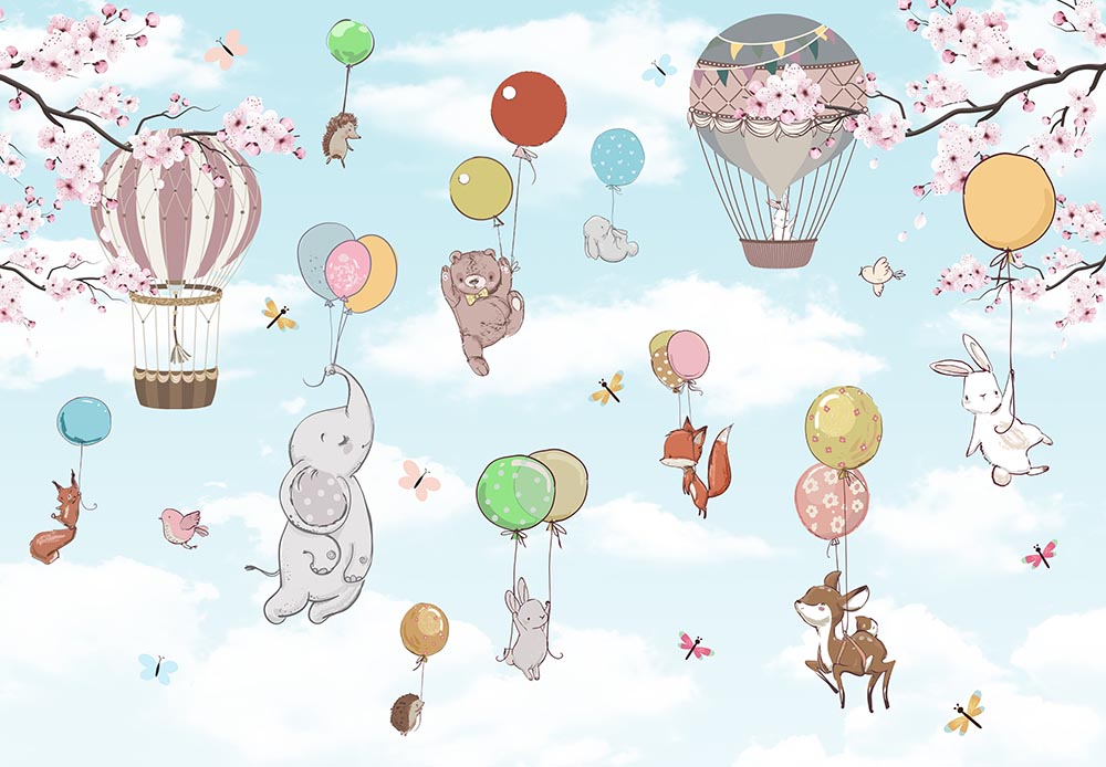 • Balonlara Asılı Sevimli Hayvanlar Çocuk Odası Duvar Kağıdı 3 boyutlu şekilde satın alın!
