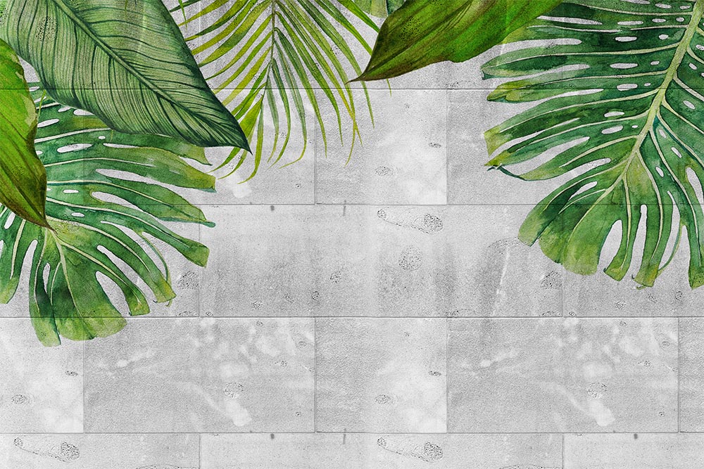 • Brüt Beton Zemin Üzerinde Tropikal Yapraklar Duvar Kağıdı 3 boyutlu şekilde satın alın!
