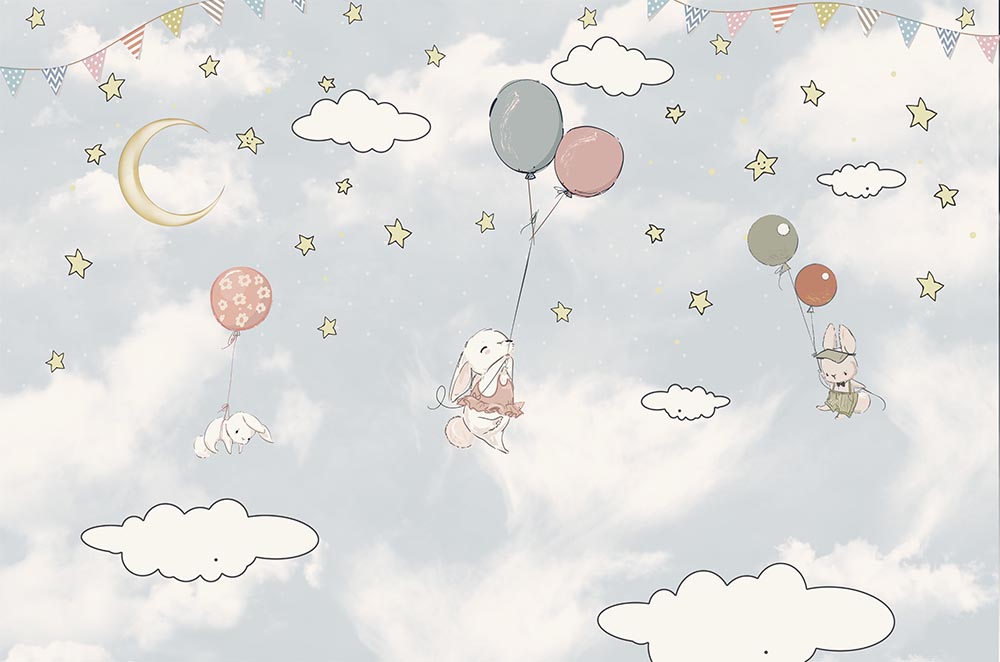 • Bulutlar Arasında Balonlar ve Tavşanlar Duvar Kağıdı 3 boyutlu şekilde satın alın!