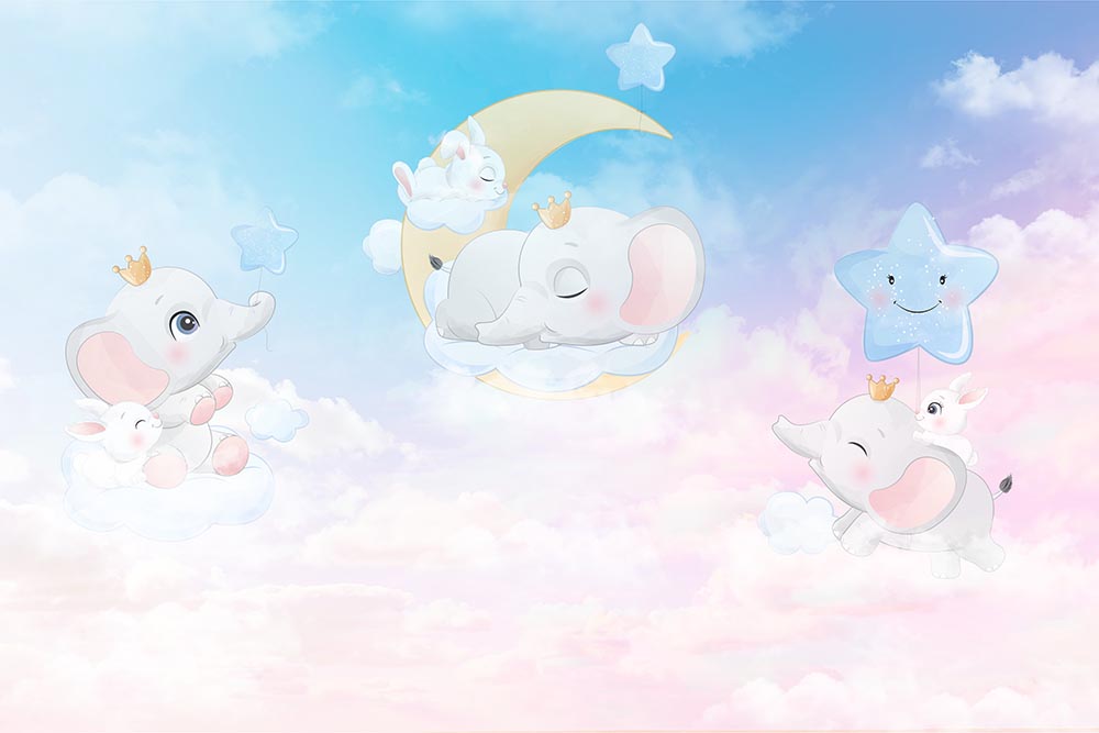 • Bulutlar Üzerinde Mutlu Filler Çocuk Odası Duvar Kağıdı 3 boyutlu şekilde satın alın!
