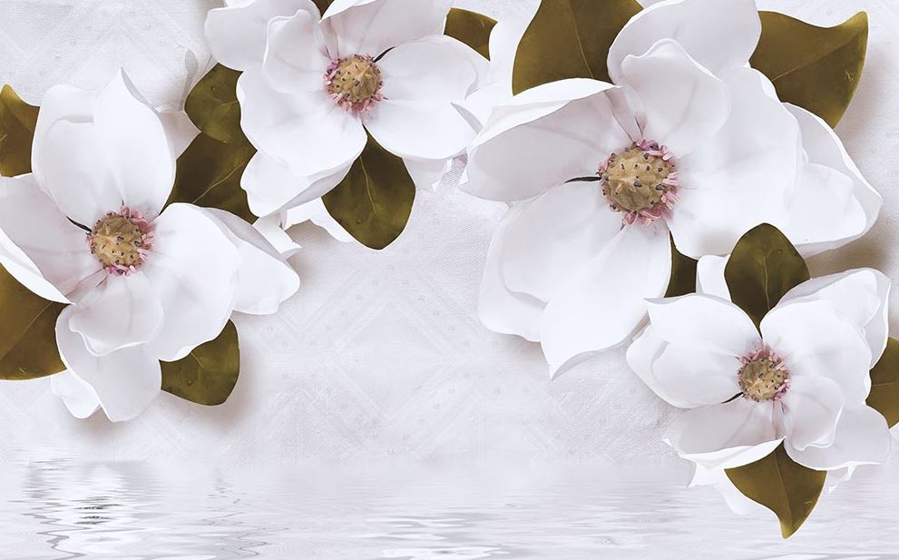 • Büyük Beyaz Çiçekler ve Yaprakları Duvar Kağıdı 3 boyutlu şekilde satın alın!