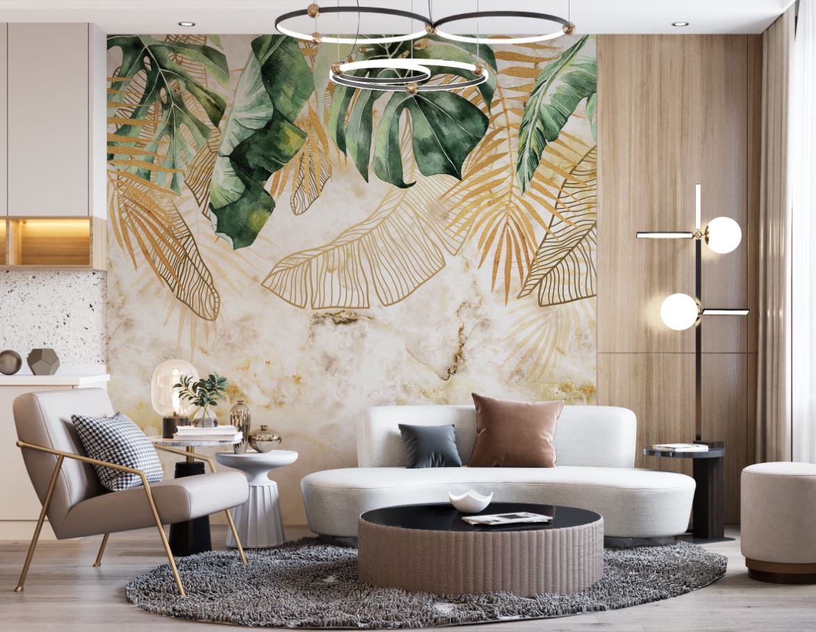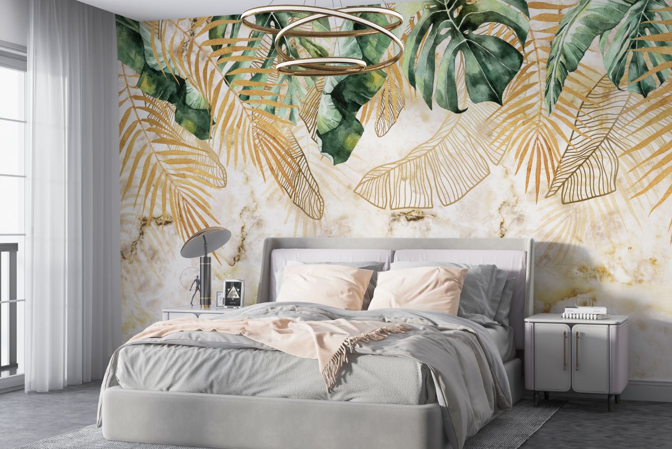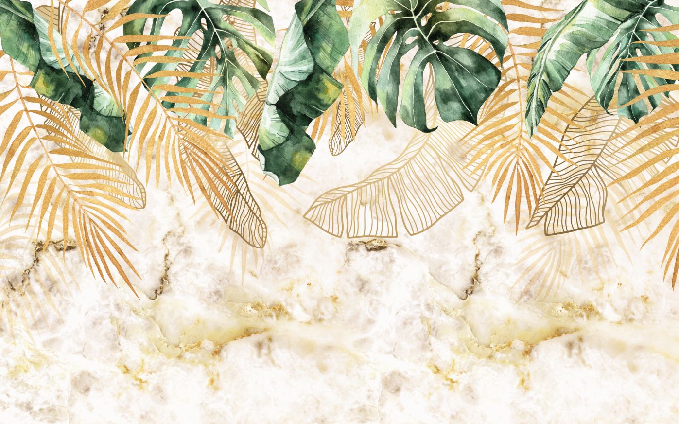 • Büyük Yeşil Tropik Yapraklar ve Gold Yapraklar Duvar Kağıdı 3 boyutlu şekilde satın alın!