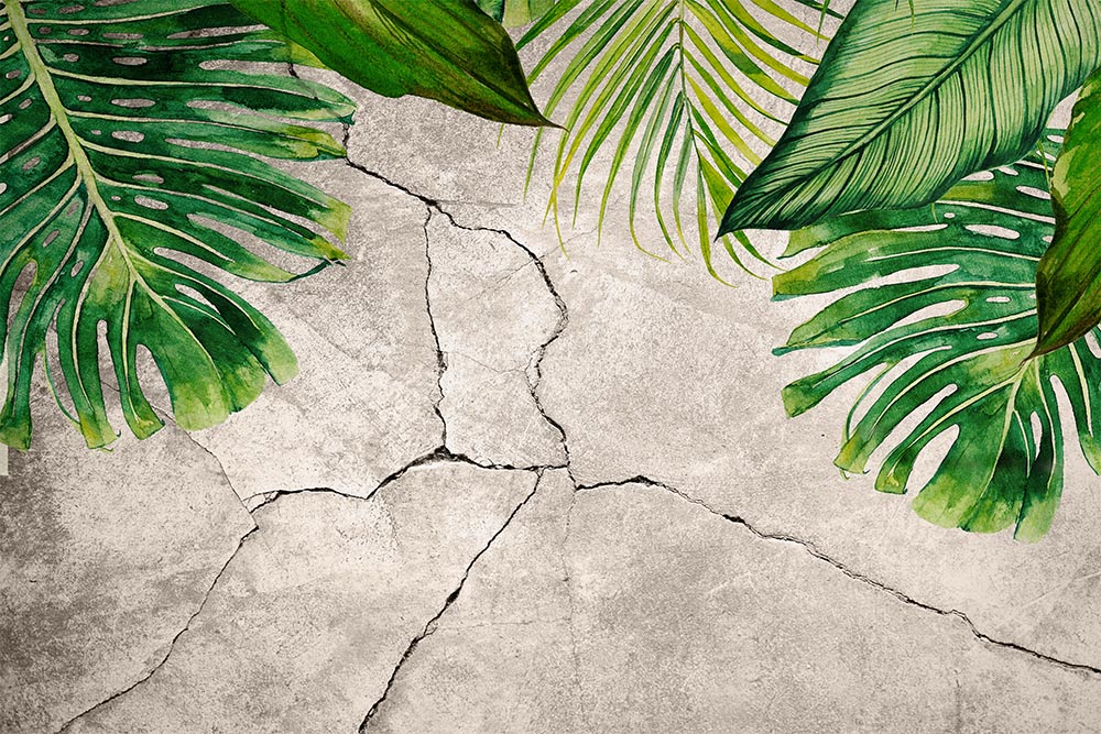 • Çatlak Beton Zemin üzerinde Tropik Yapraklar Duvar Kağıdı 3 boyutlu şekilde satın alın!
