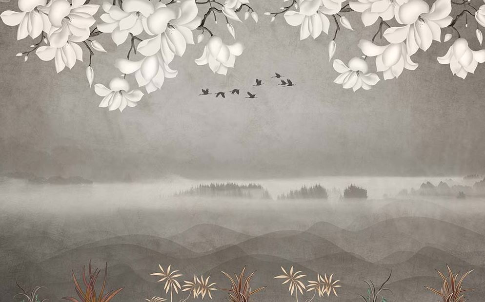• Çiçekler Kuşlar ve Sisli Manzara Duvar Kağıdı 3 boyutlu şekilde satın alın!