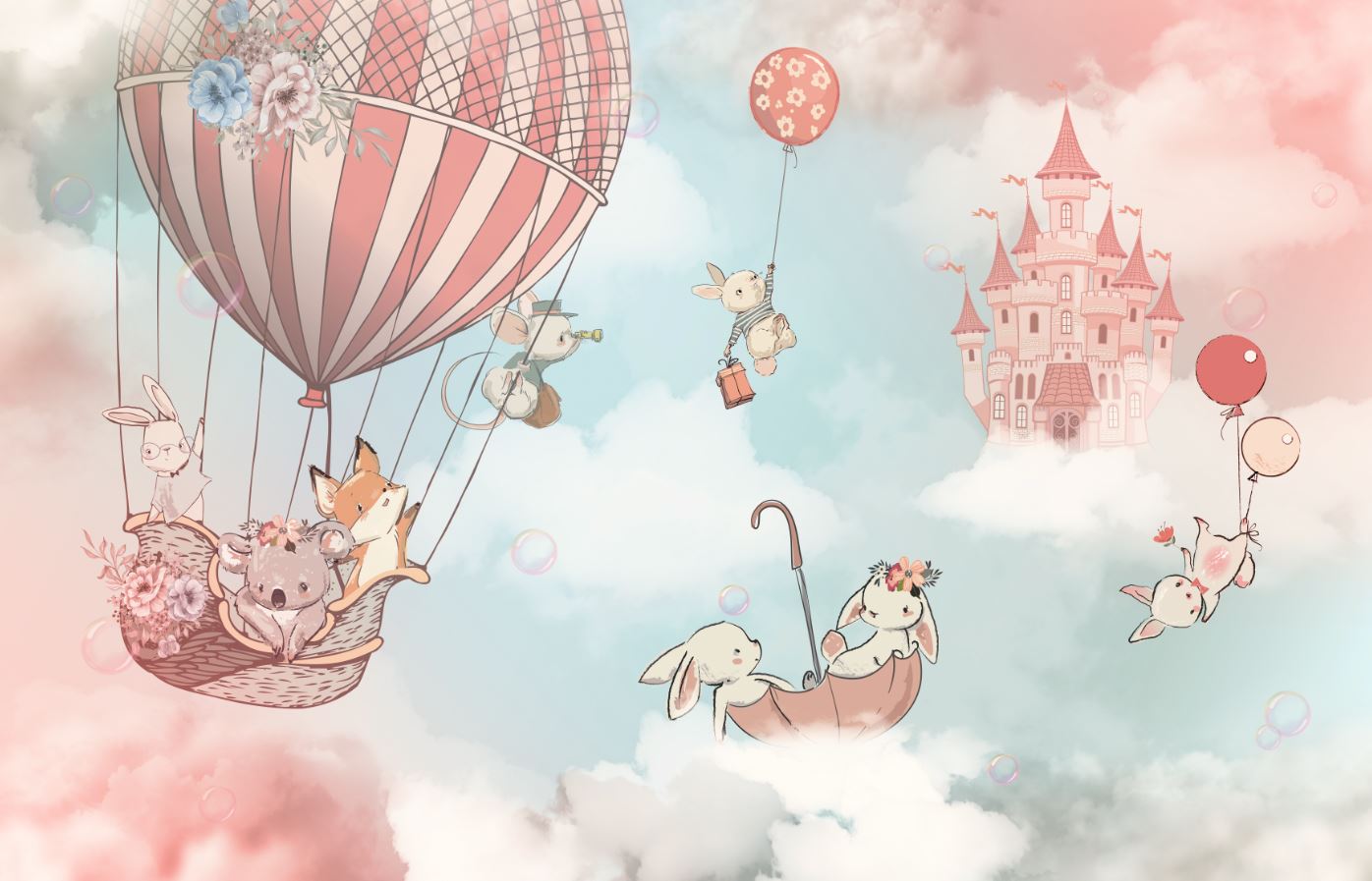 • Çocuk Odası Bulutlu Duvar Kağıdı, Gökyüzündeki Sevimli Hayvanlar 3 boyutlu şekilde satın alın!