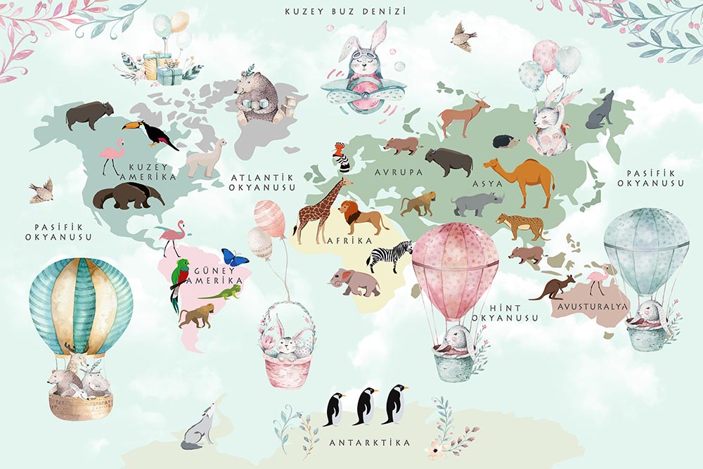 • Dünya Haritası Sevimli Tavşanlar Çocuk Odası Duvar Kağıdı 3 boyutlu şekilde satın alın!