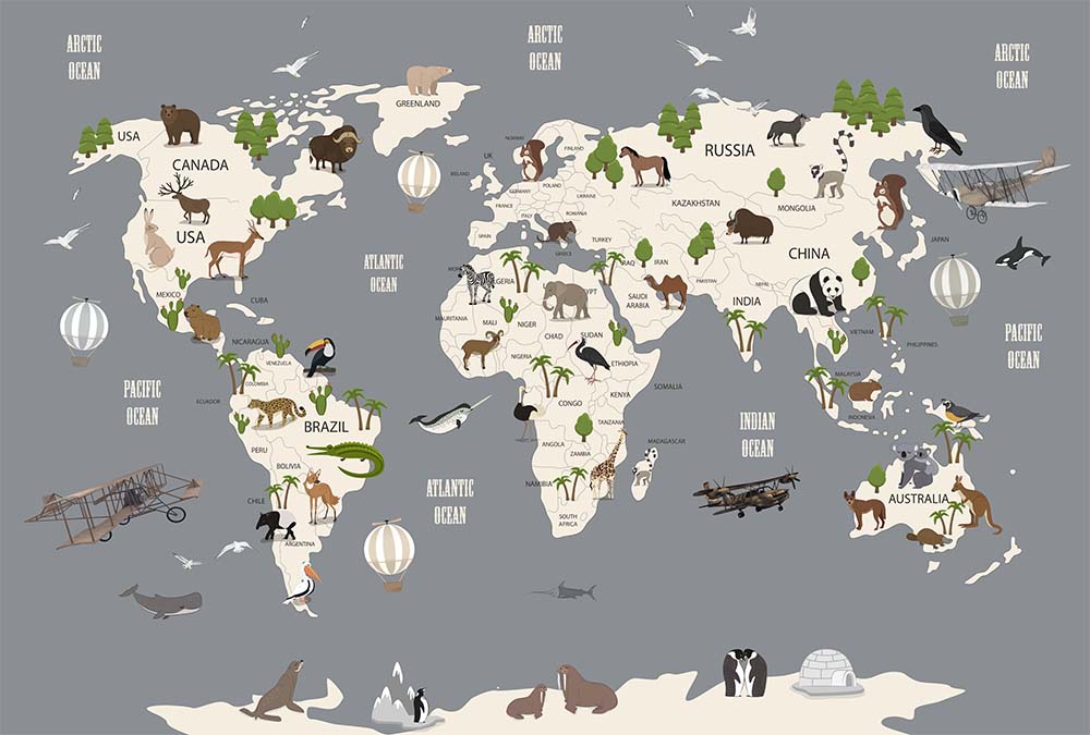 Dünya Haritası Ülkeler Okyanuslar ve Canlılar Çocuk Odası Duvar Kağıdı