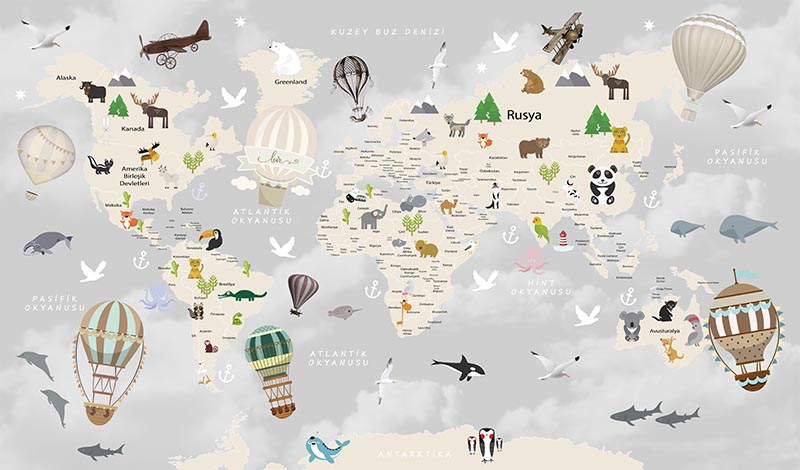 • Dünya Haritası ve Canlılar (Türkçe Yazılar) Eğitici Duvar Kağıdı 3 boyutlu şekilde satın alın!