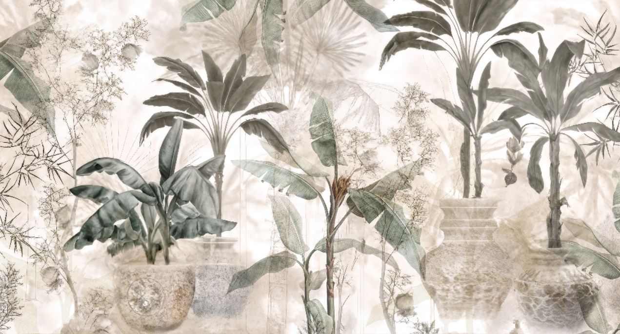 • Eskitme Vintage Tarz Vazolar içerisinde Tropikal Ağaçlar duvar Kağıdı 3 boyutlu şekilde satın alın!