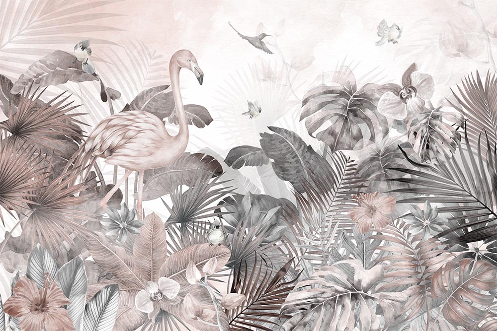 • Gri Pembe Tropikal Yapraklar ve Flamingo Özel Tasarım Duvar Kağıdı 3 boyutlu şekilde satın alın!
