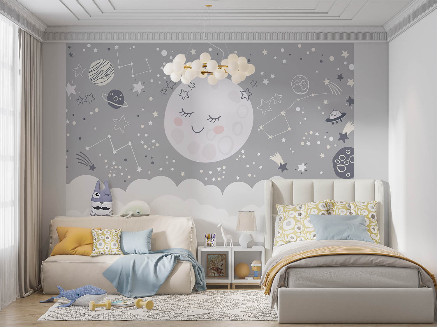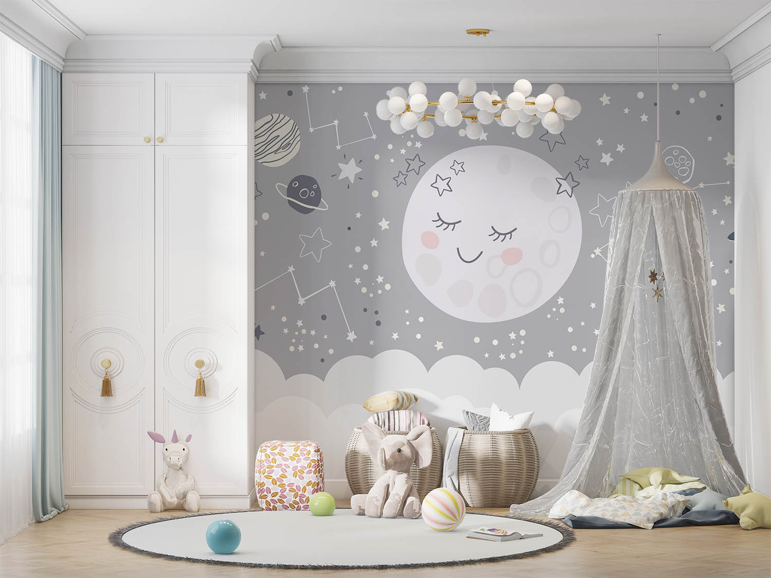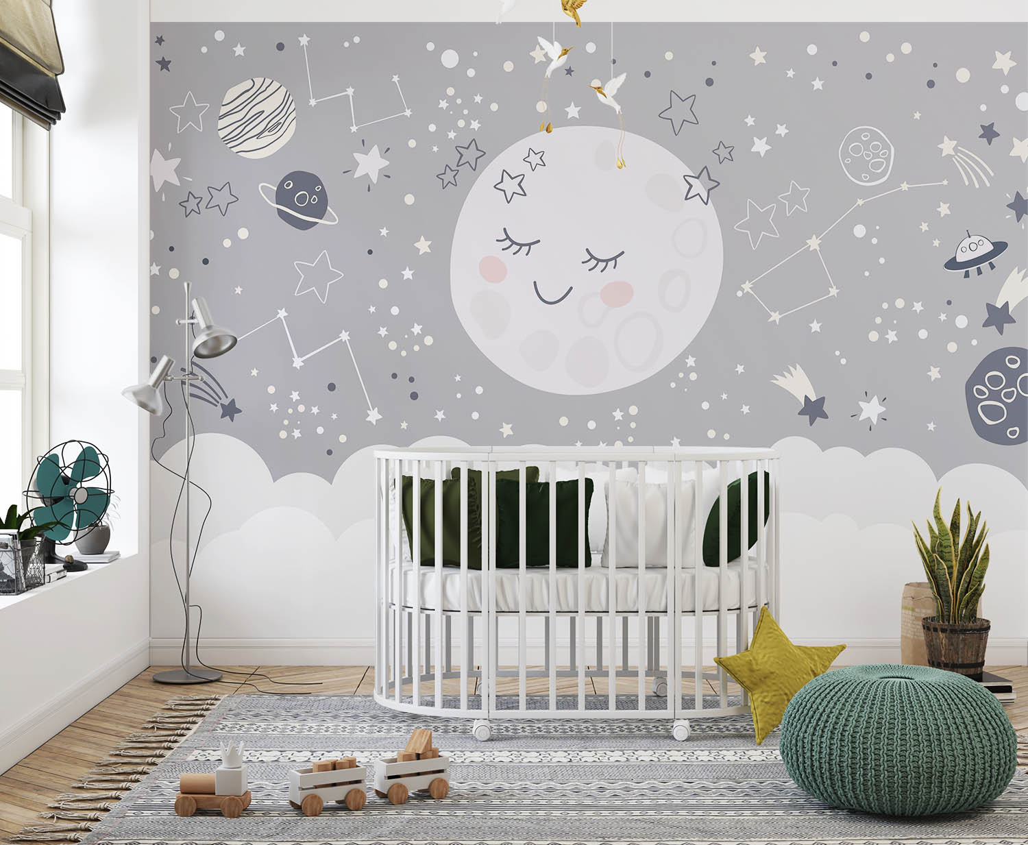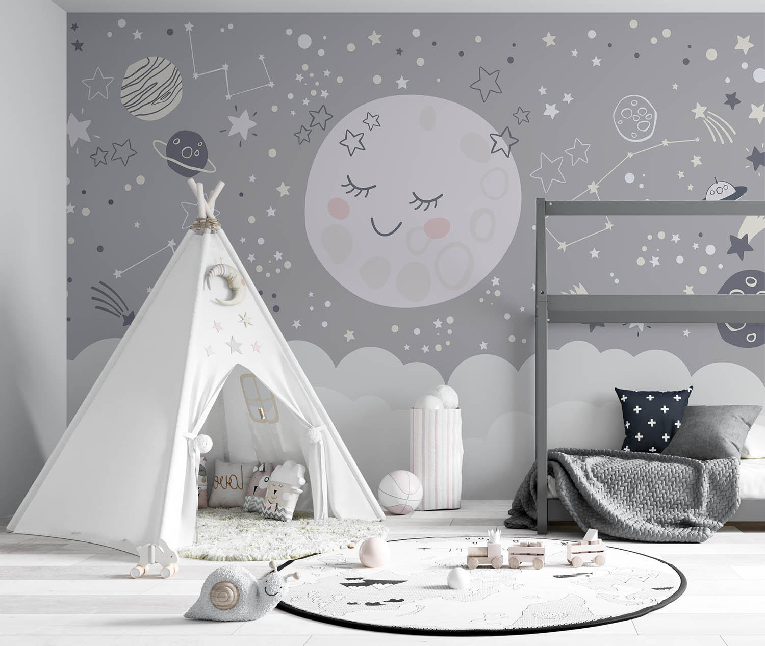 • Gri Renklerde Sevimli Ay ve Gezegenler Çocuk Odası Duvar Kağıdı 3 boyutlu şekilde satın alın!