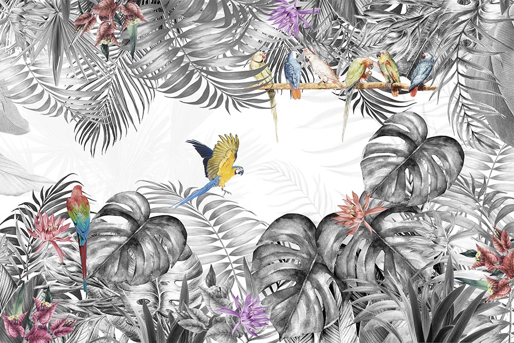 • Gri Tropikal Yapraklar Üzerinde Renkli Kuşlar Duvar Kağıdı 3 boyutlu şekilde satın alın!