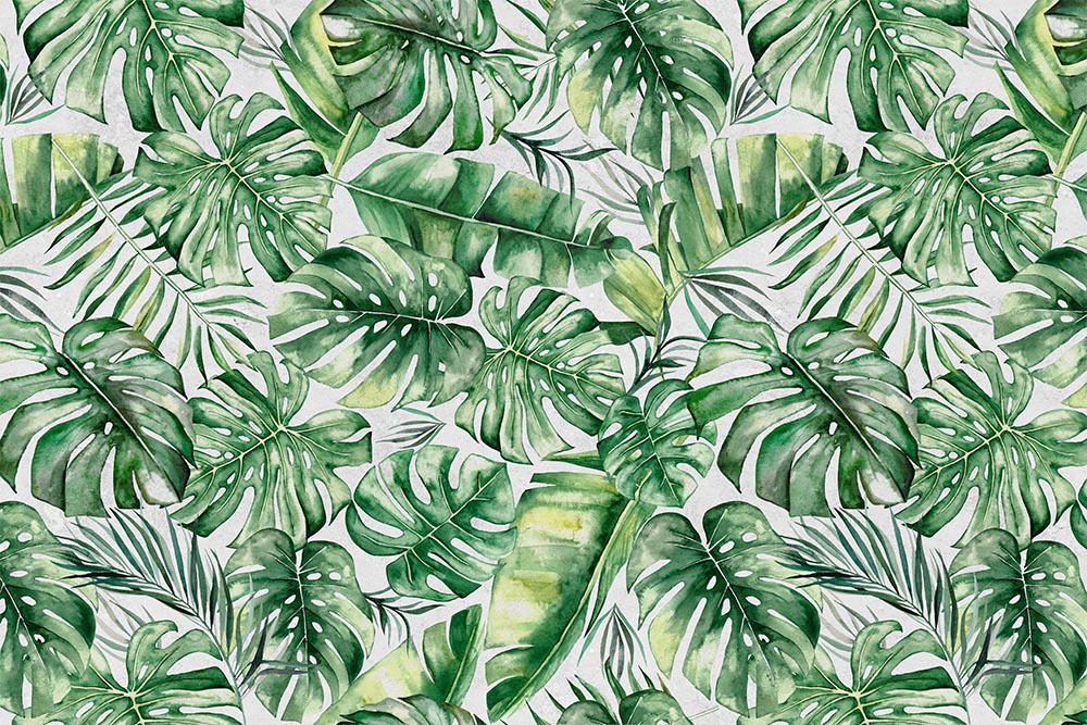 • Gri Zemin Üzerinde Yeşil Tropik Yapraklar Duvar Kağıdı 3 boyutlu şekilde satın alın!