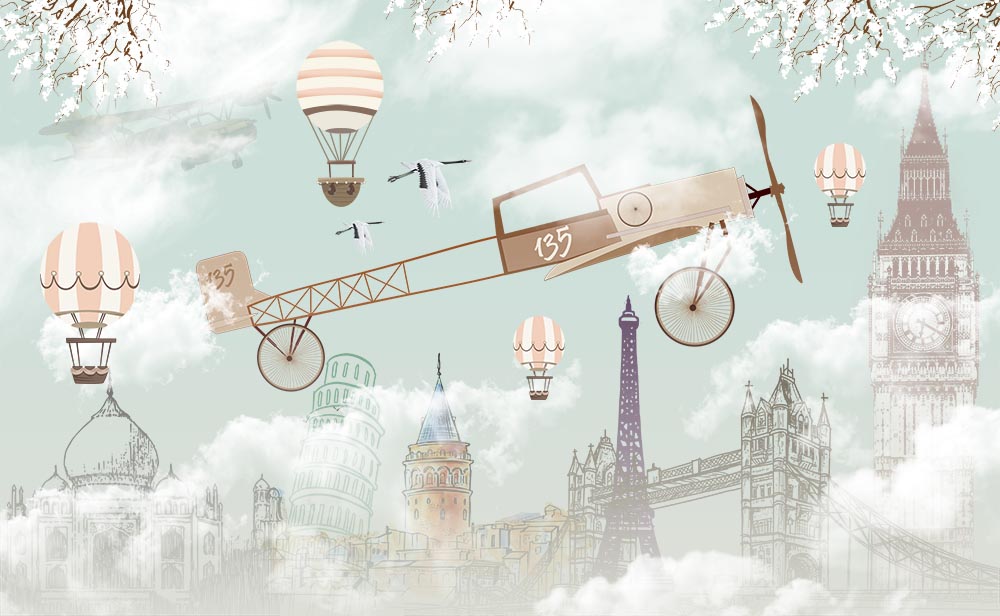 • Kanatlı Uçak ve Uçan Balonlar Çocuk Odası Duvar Kağıdı 3 boyutlu şekilde satın alın!