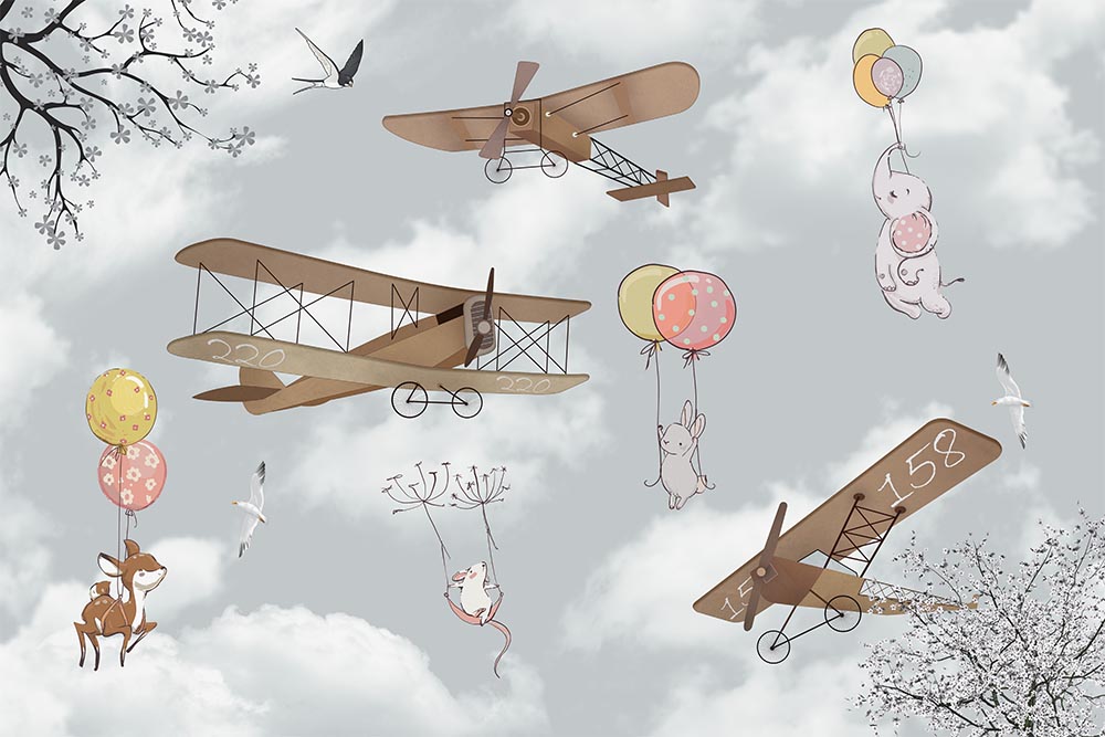 • Kanatlı Uçaklar ve Sevimli Hayvanlar Çocuk Odası Duvar Kağıdı 3 boyutlu şekilde satın alın!