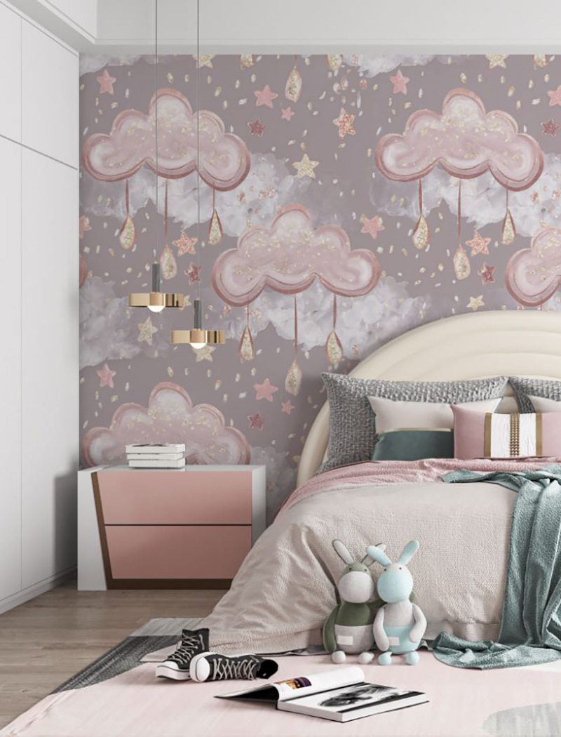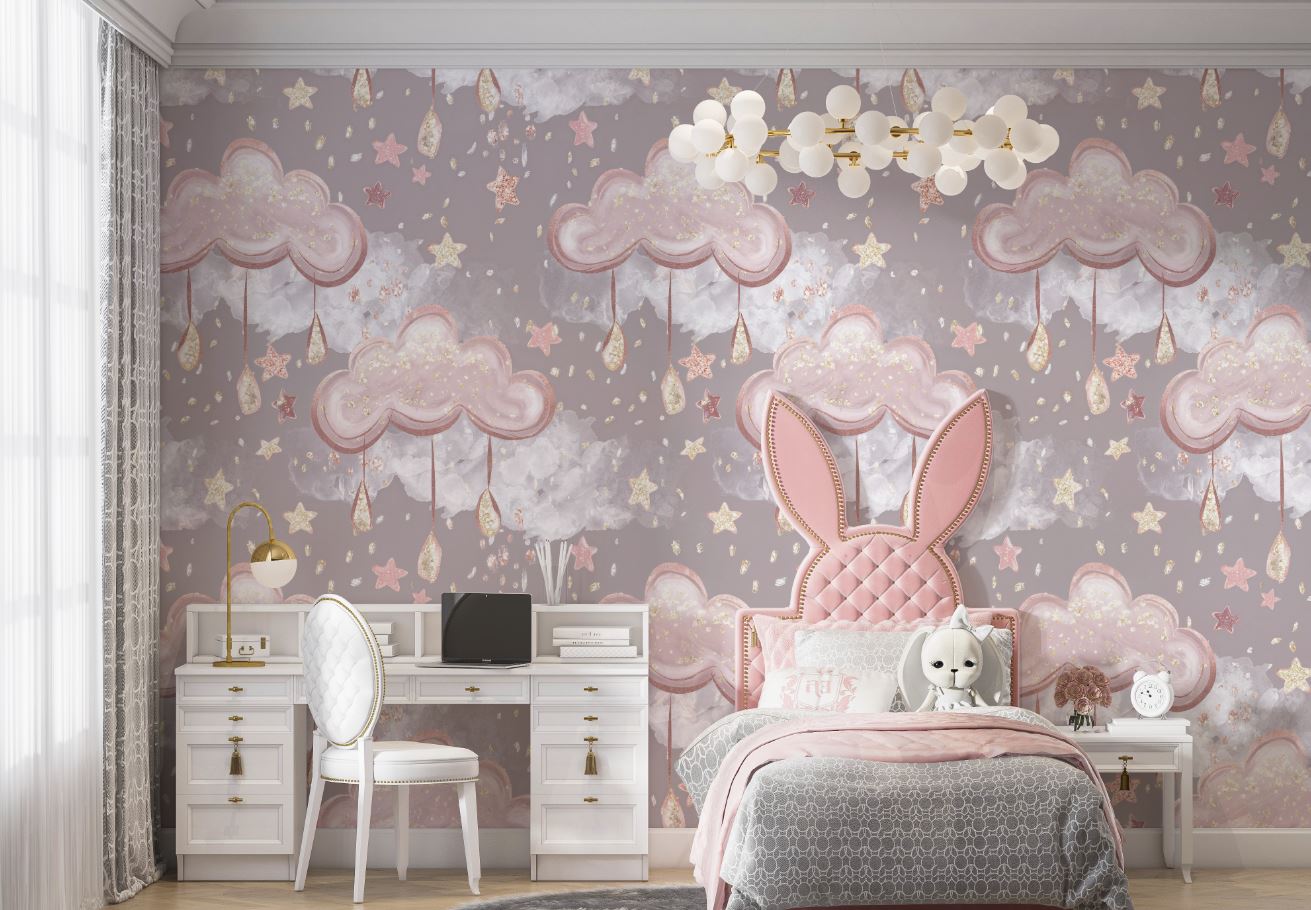 • Kız Çocuk Odası Duvar Kağıdı Pembe Bulutlar ve Damlalar 3 boyutlu şekilde satın alın!
