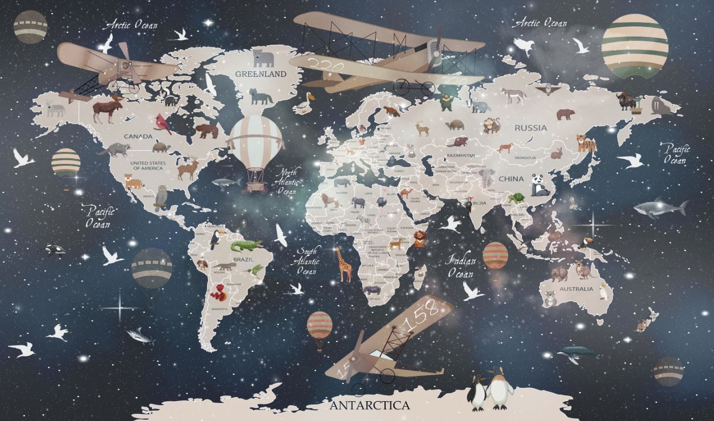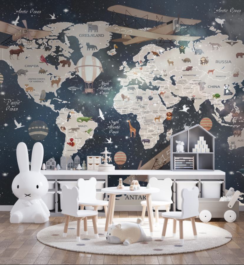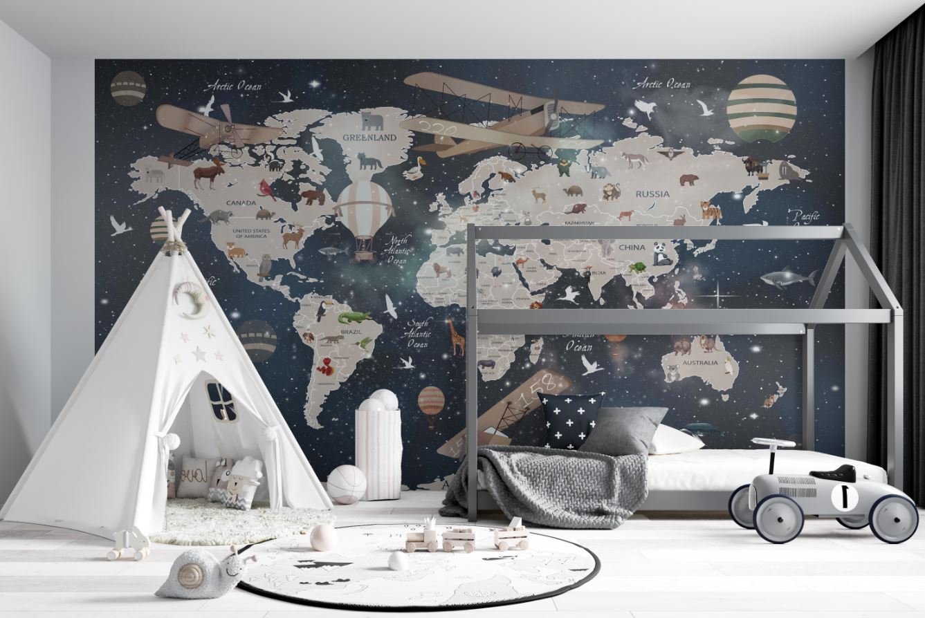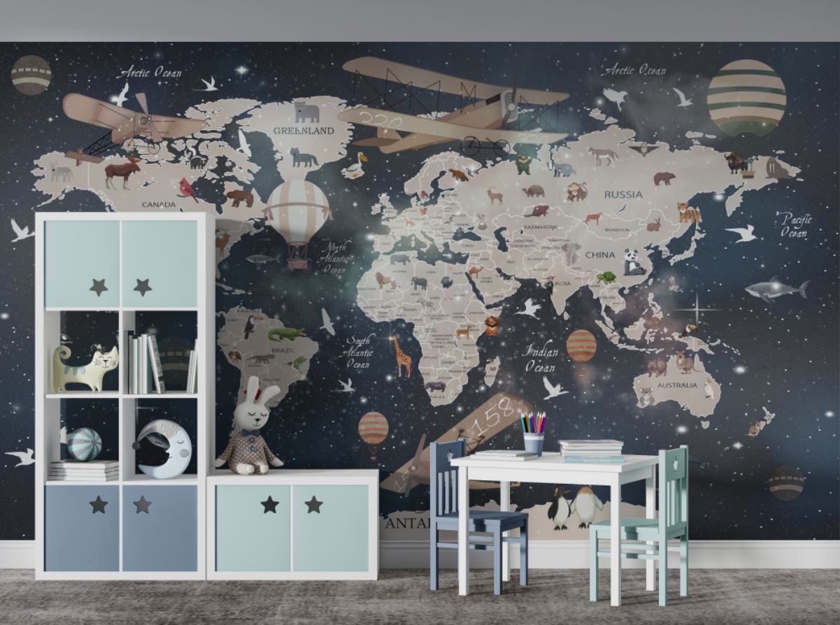 • Koyu Renklerde Eğitici Çocuk Odası Dünya Haritası Duvar Kağıdı 3 boyutlu şekilde satın alın!