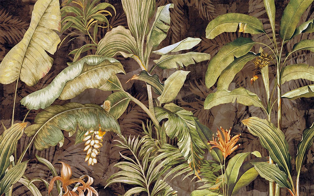 • Koyu Zemin Üzerinde Büyük Tropikal Yapraklar Duvar Kağıdı 3 boyutlu şekilde satın alın!